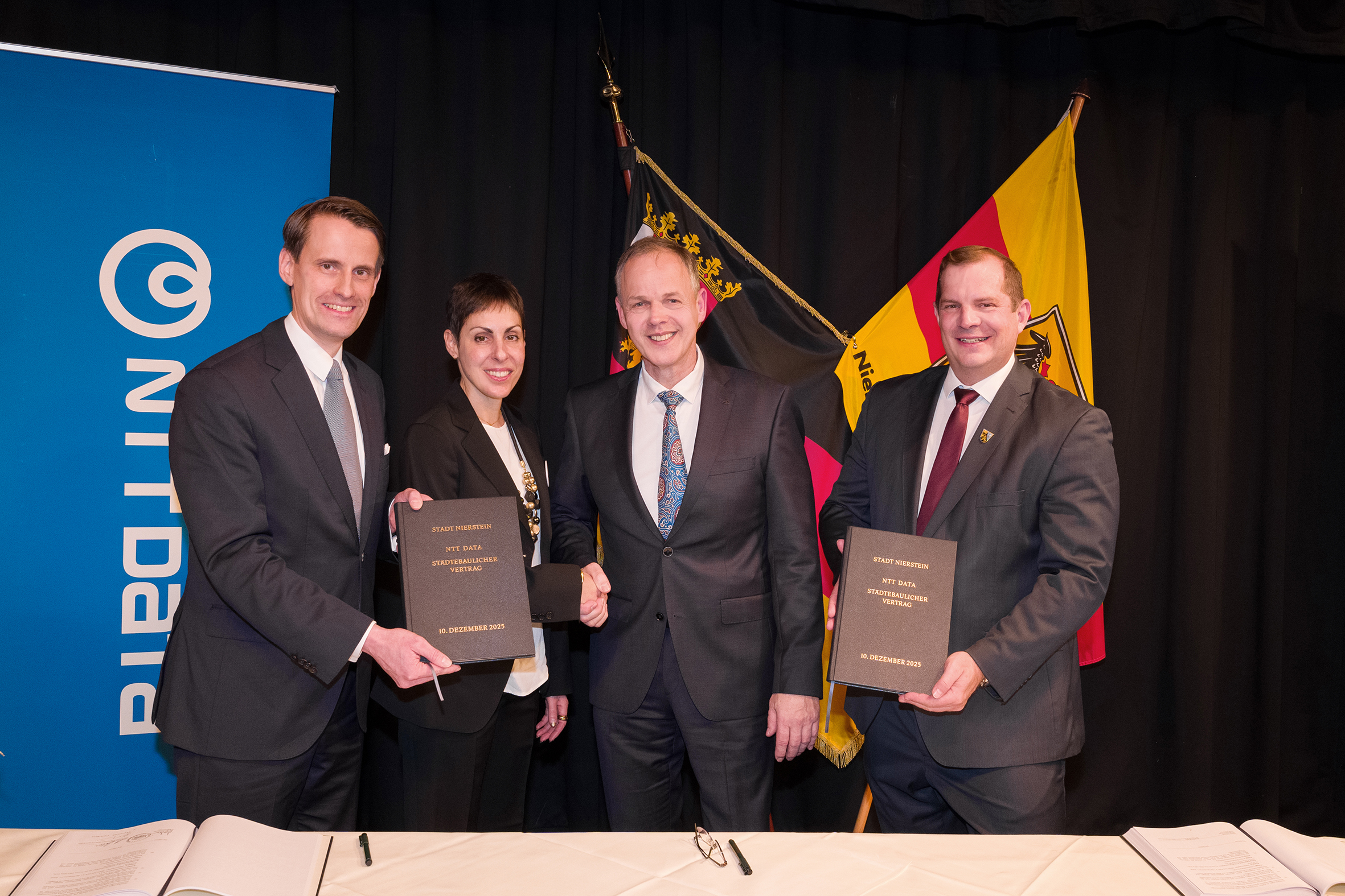 Im Rahmen der Stadtratssitzung wurde der städtebauliche Vertrag zwischen der Stadt Nierstein und Global Data Centers, einem Geschäftsbereich von NTT DATA, unterzeichnet. - Von links: Jörg Reinshagen (Verantwortlicher Standortentwicklung/Recht NTT DATA), Nausicaa Voukalis (Leiterin Standortentwicklung NTT DATA), Jochen Schmitt (Bürgermeister Stadt Nierstein), Martin Groth (Bürgermeister Verbandsgemeinde Rhein-Selz).